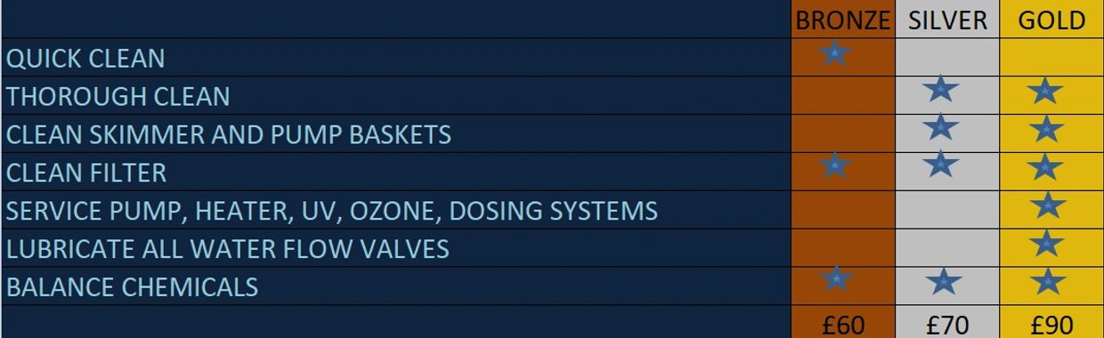 If you are having problems with water clarity, chemical balancing or it’s just dirty, we have a maintenance service for you. Just see the below chart to see which best suits you.